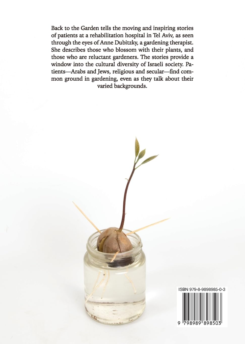 Illustrated with beautiful studio photos of plants, Back to the Garden tells the stories of patients at a rehabilitation hospital in Tel Aviv, as seen through the eyes of Anne Dubitzky, a gardening therapist. She describes those who blossom with their plants, and those who are reluctant gardeners. Some of her patients can respond to the scent of herbs only with eye blinks, and others find renewed strength with a spade and shears in hand. The stories provide a window into the cultural diversity of Israeli society. Patients -- Arabs and Jews, religious and secular -- find common ground in gardening, even as they talk about their varied backgrounds.