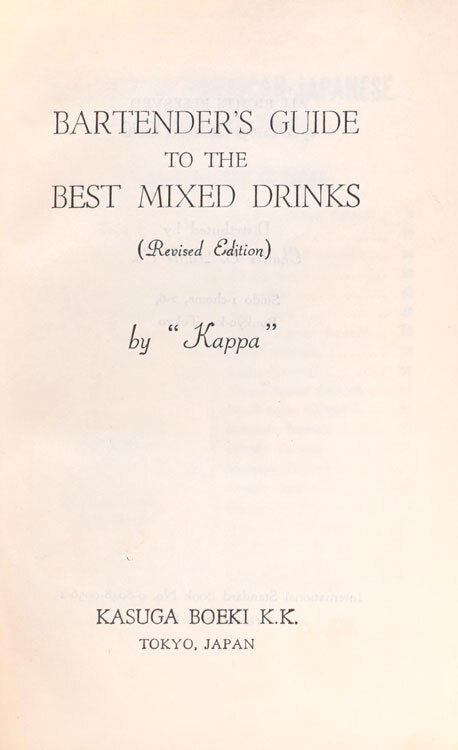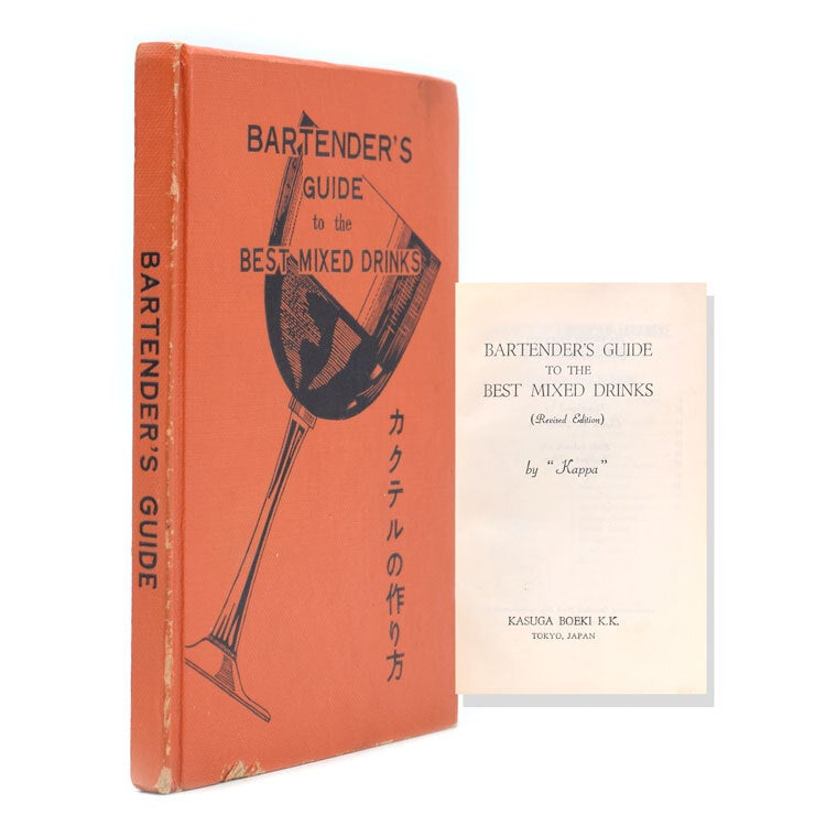 Revised edition. 3 pages of photographs of Bar utensils. 143, 7pp. Text in English and Japanese. Printed in Japan. 12mo. Bilingual, with each cocktail recipe in English and Japanese; the English index at the front and the Japanese at the back. Three pages of photographs of bar utensils and glassware. The contents page is subtitled "Contents of American-Japanese Bartenders Guide". Distributed by the Suido, Bunkyo-ku Tokyo office of Charles Tuttle & Co; thus, although undated, post-1954 when that office opened. A small, well indexed, guide to 220 cocktails, clearly designed for professional/commercial use in Japan issued shortly after the US occupation of Japan finished. An interesting insight into post World War II Japan's and the adoption of American cocktail culture. OCLC only records 1 copy pre 1976 - UC Davis; not this edition. Noling p.687 Hardcover, orange cloth boards, black embossed lettered illustrations. Spine professionally and neatly re-backed with new end-papers; edges to boards rubbed; internally small signs of professional use 3 pages of photographs of Bar utensils. 143, 7pp. Text in English and Japanese. Printed in Japan. 12mo.