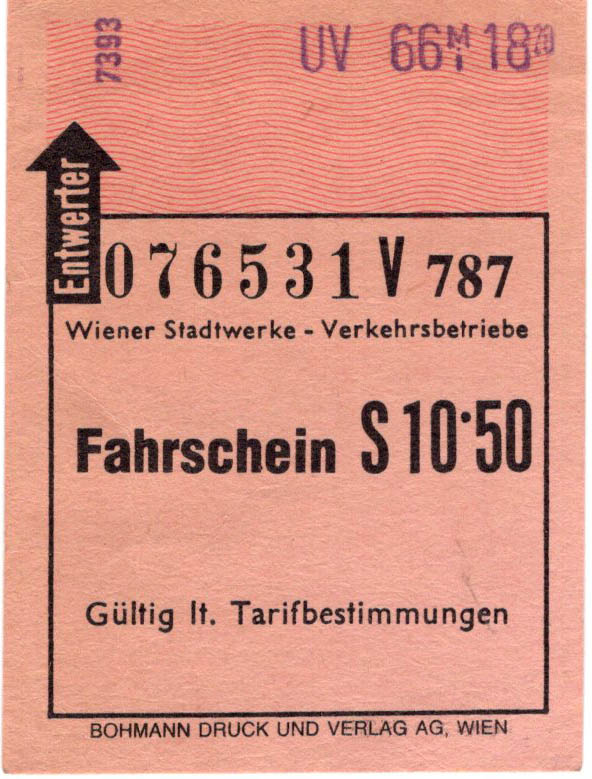 Add to basketStamped ticket "Fahrschein S 10.50" for transportation in Vienna (Wien). Text in German.