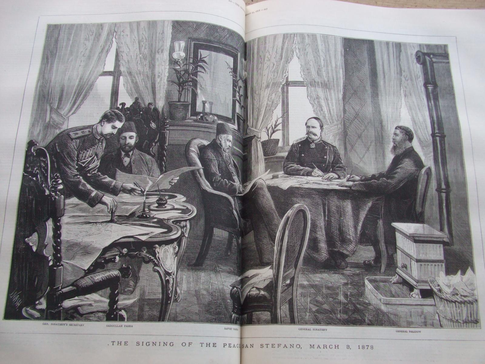 Add to basketThe Graphic Newspaper. From January 5th to June 29th, 1878. 652 pages, plus 36 pages summer number. Bound in original publishers quarter calf, marble boards. Binding, rubbed, scuffed, section missing from spine,hinge joints wear, but boards holding. Internally, pages in very good clean bright condition throughout. A very good clean copy. Some of the contents of this volume. Osman Pasha. Turks at Constantinople. Turkish Prisoners. War in South Africa. H. M. Stanley Central Africa. Constantinople. Exhibition Paris. Size: Folio - over 12" - 15" tall.