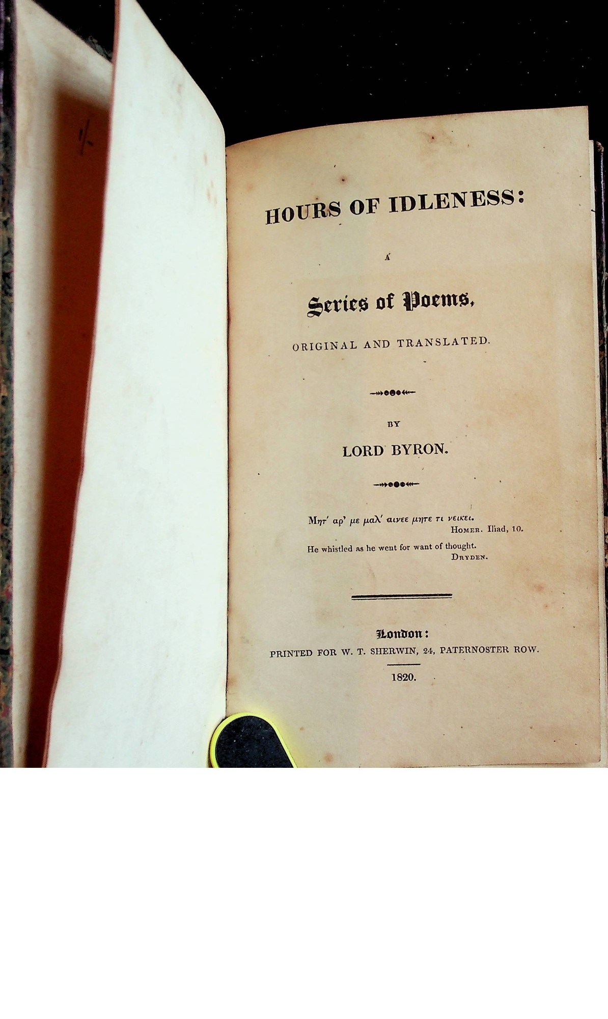 Add to basketVery good overall Period 3/4 leather with marbled boards, only slightly scuffed Ink signature of an early owner (1835) on the dedication page is the only marking Title, dedication page, and Contents [2}, 160 pp This is apparently the sixth edition of Hours of Idleness, [supposedly an unauthorized edition which was later suppressed, and which has 'The Second Edition" stated on the dedication page] which was the first volume of poetry published by Lord Byron, in 1807, when he was 19 years old It is a collection of mostly short poems, many in imitation of classic Roman poets .