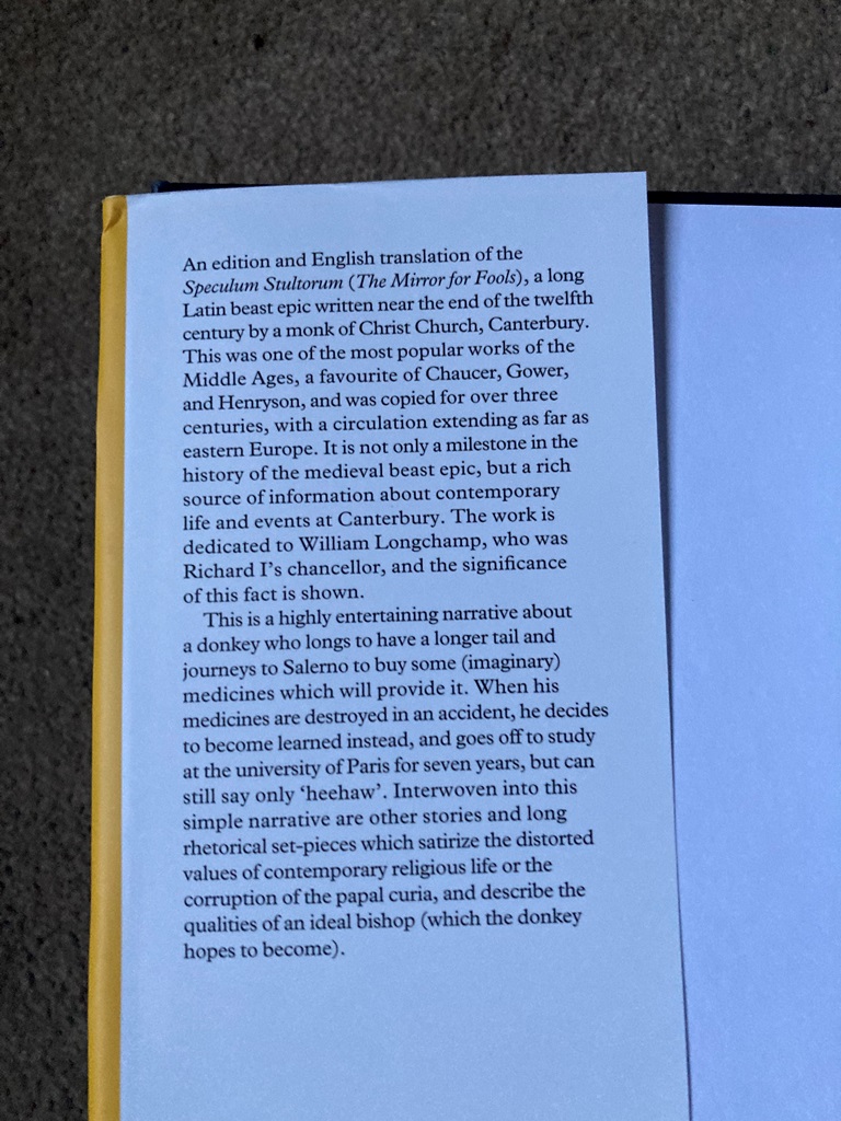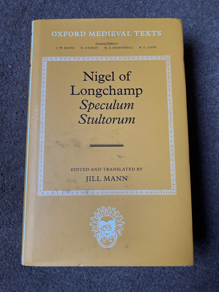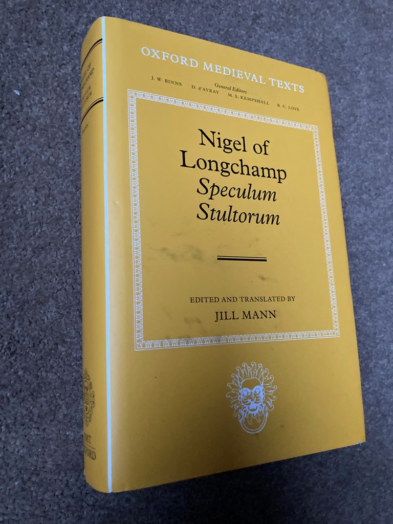 An edition and English translation of the Speculum Stultorum (The Mirror for Fools), a long Latin beast epic written near the end of the twelfth century by a monk of Christ Church, Canterbury. This was one of the most popular works of the Middle Ages, a favourite of Chaucer, Gower, and Henryson, and was copied for over three centuries, with a circulation extending as far as eastern Europe. It is not only a milestone in the history of medieval beast epic, but a rich source of information about contemporary life and events at Canterbury. The work is dedicated to William Longchamp, who was Richard I's chancellor, and the significance of this fact is shown.