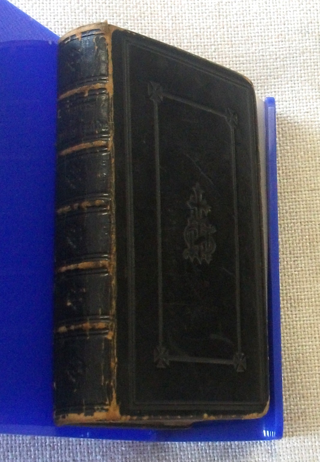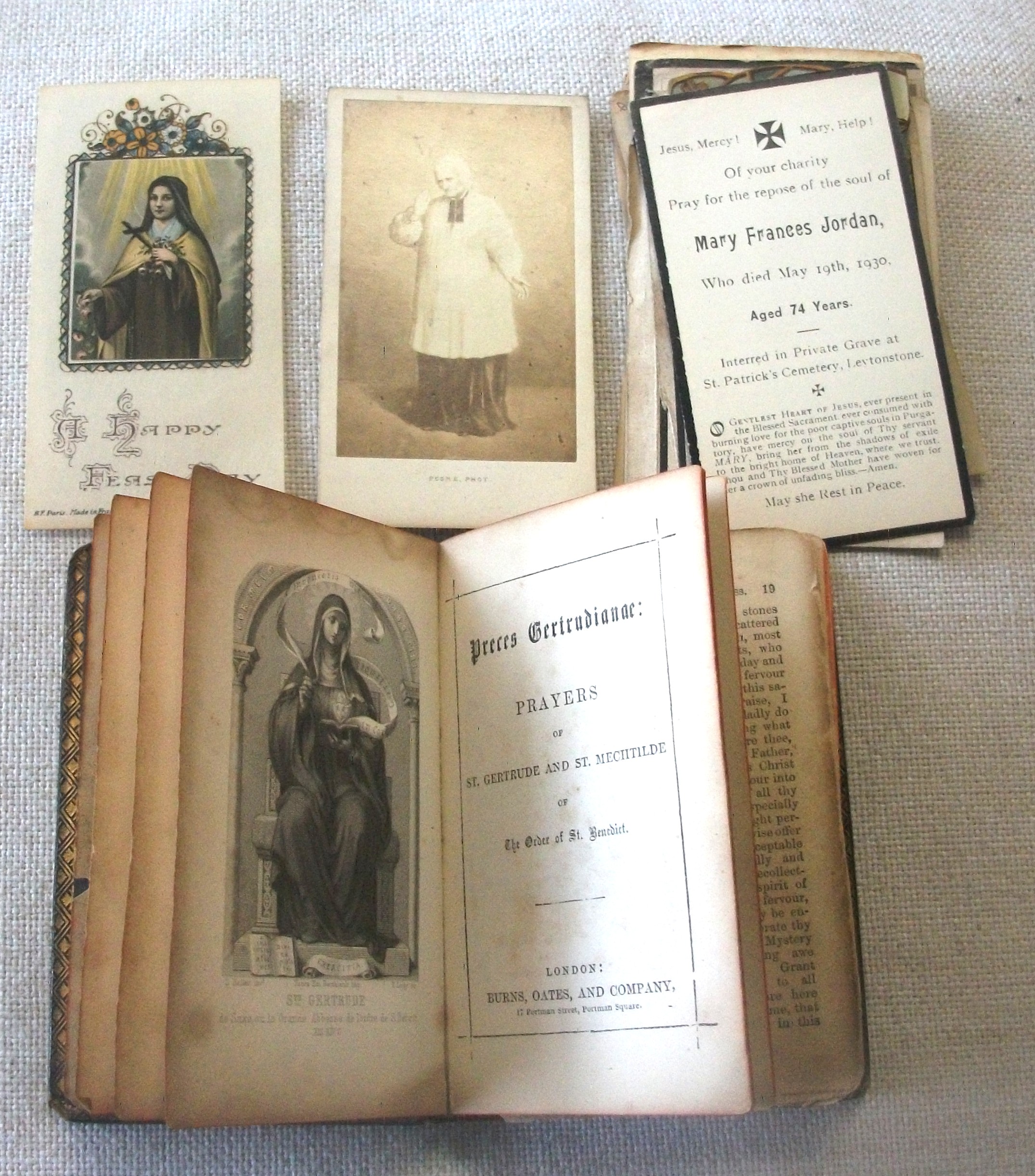 Preces Gertrudianae : prayers of St. Gertrude and St. Mechtilde of the Order of St. Benedict. London: Burns, Oates, and Company, s.d. [1861]. Hardback, Fair. 12 x 8cm approx. Black leather, bumped to corners, rubbed to edges and spine bands. Blind embossed frames and decorations to front and back. Spine in six panels with five raised bands; lettering to panel 2, faded. Binding cracked along the inner gutter between pp. 18-19, so the following gathering is loose, but not detached. Light foxing to endpapers. Frontispiece b/w illustration of St. Gertrude. 280pp., contents clean. Edges of the block stained red, faded. Loosely inserted a selection of mass cards and other Catholic ephemera dating from 1860s to 1930, which have been used as bookmarks throughout the volume. Scarce. RightWayUp Books aims to provide accurate and detailed descriptions. All images are of the actual book for sale - no stock images are ever used. Thank you for looking at this listing. Seller Inventory # ABE-1753712329690
