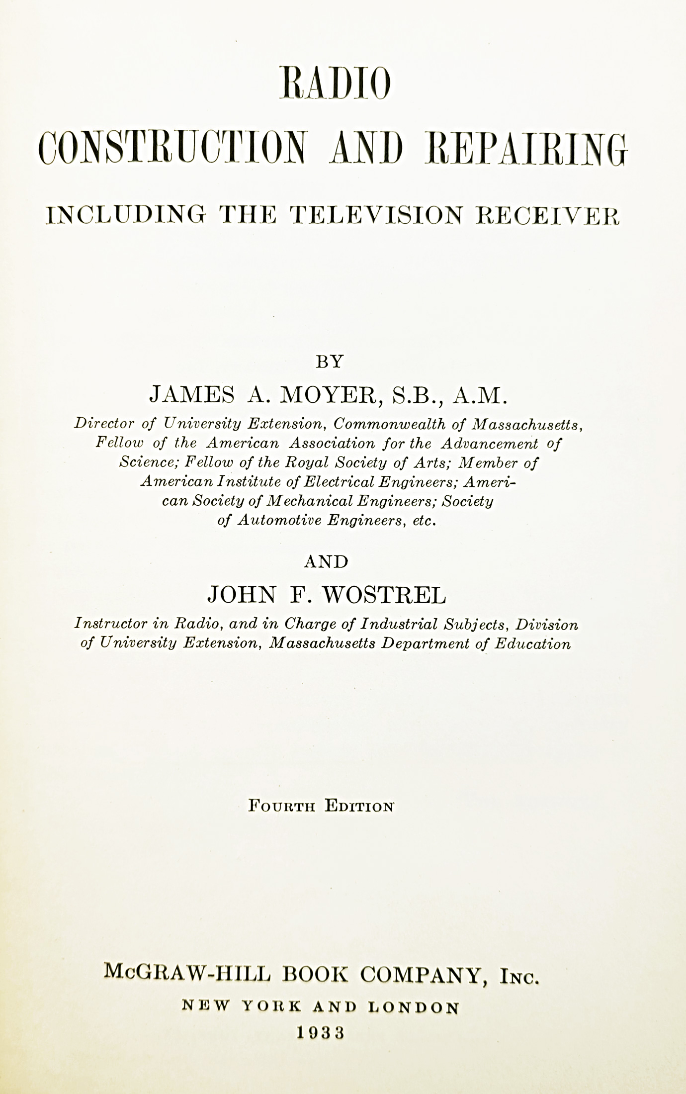 Fourth Edition. Dark green cloth with gilt lettering on spine. A few very minor spots of soiling else an attractive and crisp copy. About 200 illustrations and diagrams. Index. Dust jacket chipped at spine ends and corners; in an archival mylar sleeve. ix, 444 pages. ''. a book that has been used by a great many radio servicemen, experimenters, set owners, amateurs and others who are interested in the working and the maintenance and repair of modern radio receivers. Written in a simple, practical manner. Contains many illustrations and diagrams and a chapter on testing and trouble-shooting. In this edition, new sections have been added on radio-noise meters, midget alternating-current or direct-current radio receivers, receiving sets for automobiles, interference suppressors, typical modern receivers with automatic volume, tone, and static controls, antenna eliminators, special antenna systems, short-wave broadcasting and reception, velocity microphones and testing sets.'' [from the front flap]. Seller Inventory # 016042