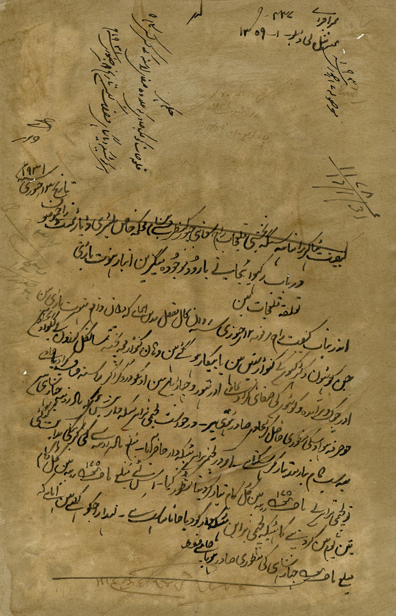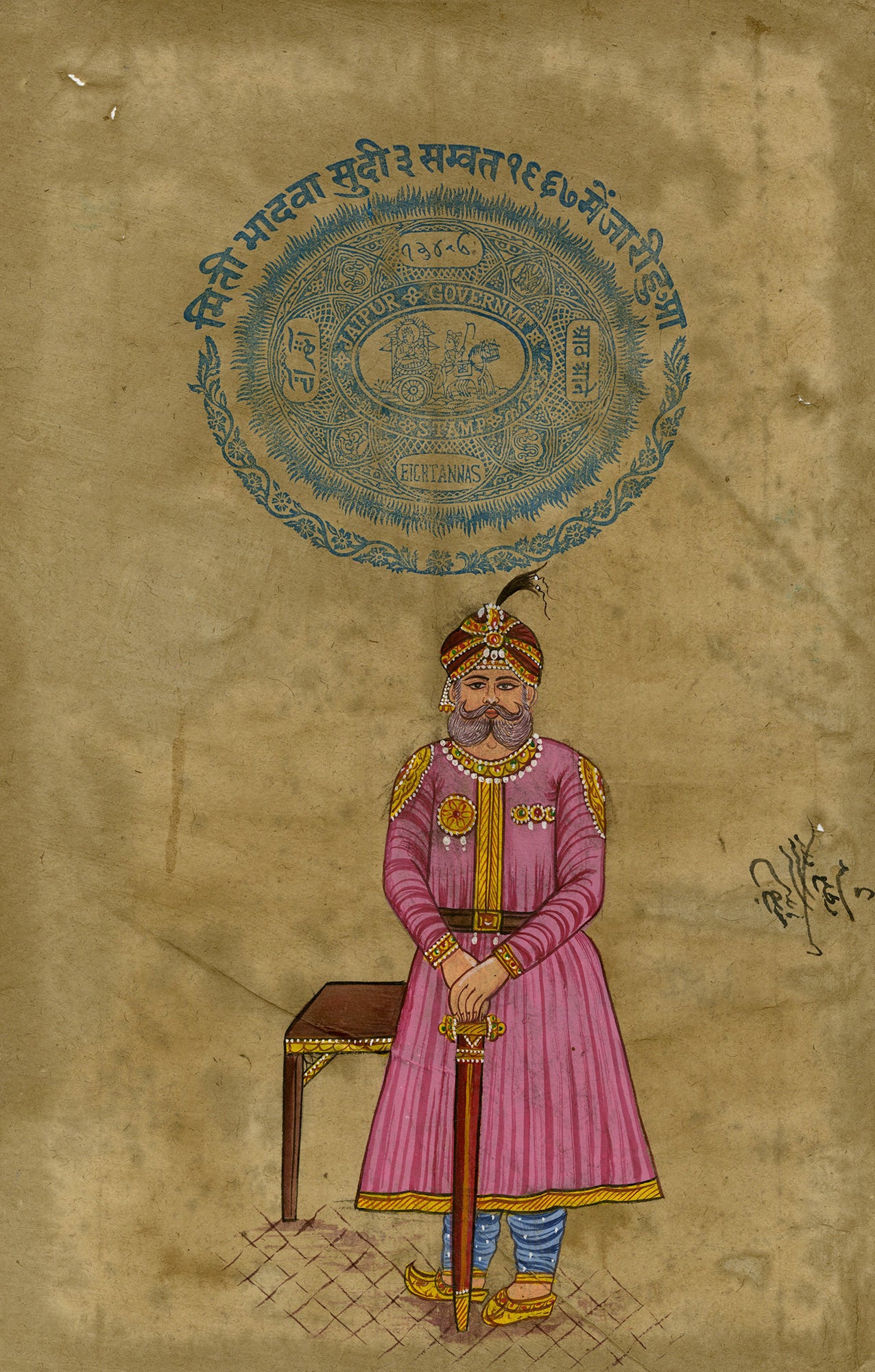 Ink and gouache with yellow heightening on fibrous, brown laid paper with a Jaipur Court Fee tax stamp in blue ink, 13 1/2 x 8 3/4 inches (343 x 222 mm). Toning, handling creases and minor scattered surface soiling throughout. There are scattered coeval Hindi inscriptions in ink on the recto. Raja Mahan Singh Mirpuri (1810 1844) was a famous general in the Sikh Khalsa Army. He was conferred by Maharaja Ranjit Singh the title of Raja for his conquests of Haripur, Nowshera and Peshawar. The town of Mansehra derives its name from him. Singh was murdered by his own soldiers in 1844, when mutiny broke out in the Sikh Khalsa Army. His death was avenged by his son, Chhattar Singh, who was himself killed soon after. The first revenue stamps in India were issued in the mid-nineteenth century during the Raj, and they are still being issued to this day. Apart from issues for the whole of India, many princely states, provinces, and other states also had (or still have) their own revenue stamp issues. Before independence, Indian revenue stamps were closely modeled on similar designs from Great Britain, as is the case with this carriage motif stamp from Jaipur. The stamps were issued to denote various denominations, including rupees and annas. An anna (or ?nna) was a currency unit formerly used in British India, equal to 1?16 of a rupee. It was subdivided into four (old) Paisa or twelve pies (thus there were 192 pies in a rupee). When the rupee was decimalized and subdivided into 100 (new) paise, one anna was therefore equivalent to 6.25 paise. This particular stamp was used as evidence of court taxes remitted for property dealings.
