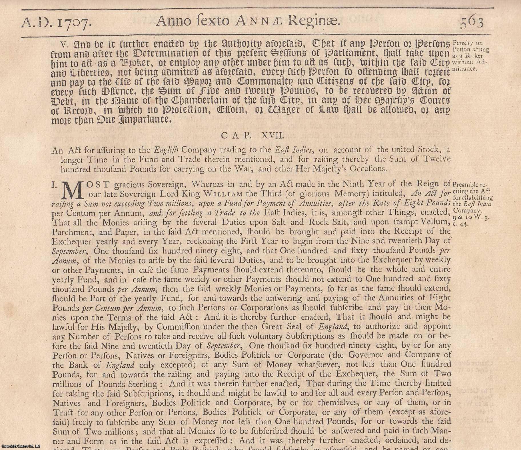 5 pages. An authentic standalone act of parliament, extracted from a larger volume. Not a reprint or reproduction, but an original work in its own right. Supplied without title page or cover. Very Good. Folio format (240mm x 390mm, 9.5 x 15 inches), separated from the Statutes at Large. Disbound from the larger volume, with no title page (as issued), and the caption title doesn't usually start at the head of the page, but some way down it. This is quite normal for Statutes. Overall condition is very good, with bright clean pages, and decent margins. Size: 24 x 39 cm. Category: Parliamentary Acts::Queen Anne; Parliamentary Acts::Statutes; Parliamentary Acts. Cosmo Books : 28 years selling on ABE; 28 years of taking care of customers on ABE; A seller you can rely on. Seller Inventory # 609301
