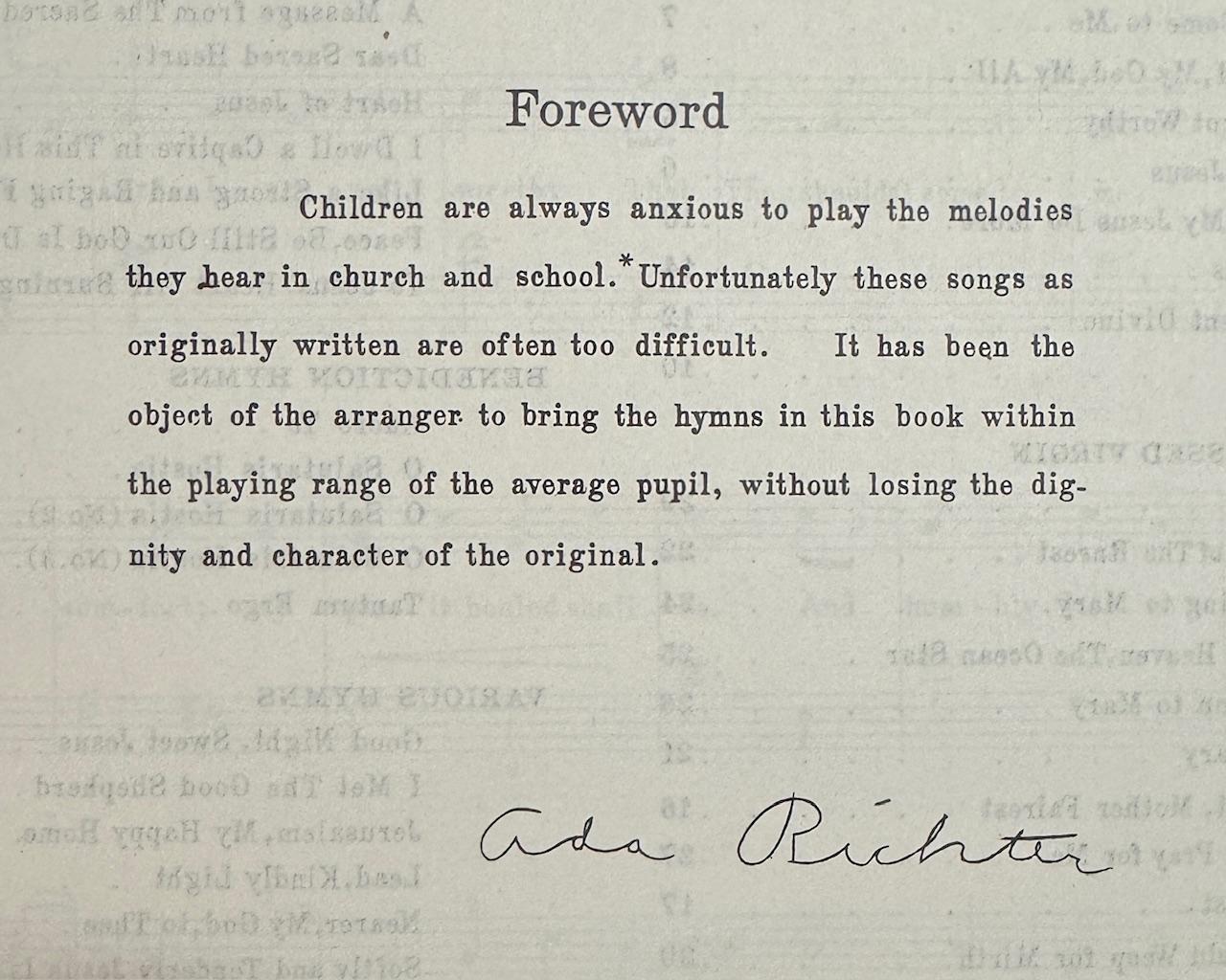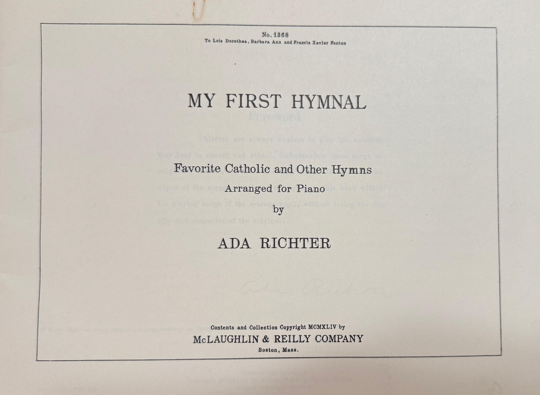Very good. No marks in scores. Previous owners names on front cover. Stapled binding is sound. 56 pages ; 23 cm. . . . . . FROM THE FOREWORD: Children are always anxious to play the melodies they hear in church and school. Unfortunately these songs as originally written are often too difficult. It has been the object of the arranger to bring the hymns in this book within the playing range of the average pupil, without losing the dignity and character of the original. . . . . . . . TABLE OF CONTENTS: 1.0) COMMUNION HYMNS: 1.1) Jesus, Jesus, Comne to Me -- 1.2) Jesus, My Lord, My God, My All -- 1.3) O Lord, I Am not Worthy -- 1.4) Only Thee My Jesus -- 1.5) O What Could My Jesus Do More -- 1.6) Panis Angelieus -- 1.7) Sweet Sacrament Divine -- 1.8) Veni, Jesu ------ 2.0) HYMNS TO THE BLESSED VIRGIN: 2.1) Ave Maria -- 2.2) Bring Flowers of The Rarest -- 2.3) Daily, Daily, Sing to Mary -- 2.4) Hail, Queen of Heaven, The Ocean Star -- 2.5) I'll Sing a Hymn to Mary -- 2.6) Immaculate Mary -- 2.7) Mother Dearest, Mother Fairest -- 2.8) Mother Dear, O Pray for Me -- 2.9) Mother of Christ -- 2.10) O Mother, I Could Weep for Mirth -- 2.11) On This Day, O Beautiful Mother -- 2.12) O Sanctissima, O Piissima ------ 3.0) HYMNS TO THE SACRED HEART: 3.1) A Message from The Sacred Heart -- 3.2) Dear Sacred Heart -- 3.3) Heart of Jesus -- 3.4) I Dwell a Captive in This Heart -- 3.5) Like a Strong and Raging Fire -- 3.6) Peace, Be Still Our God Is Dwelling -- 3.7) To Jesus' Heart All Burning ------ 4.0) BENEDICTION HYMNS: 4.1) Adoro Te -- 4.2) O Salutaris Hostia -- 4.3) O Salutaris Hostia (No.2) -- 4.4) O Salutaris Hostia (No.3) -- 4.5) O Tantum Ergo ------ 5.0) VARIOUS HYMNS: 5.1) Good Night, Sweet Jesus -- 5.2) I Met The Good 8hepherd -- 5.3) Jerusalem, My Happy Home -- 5.4) Lead, Kindly Light -- 5.5) Nearer, My God, to Thee -- 5.6) Softly and Tenderly Jesus Is Calling -- 5.7) Sweet Saviour! Bless Us Ere We Go -- 5.8) What Shall I Render. Seller Inventory # 2412010001