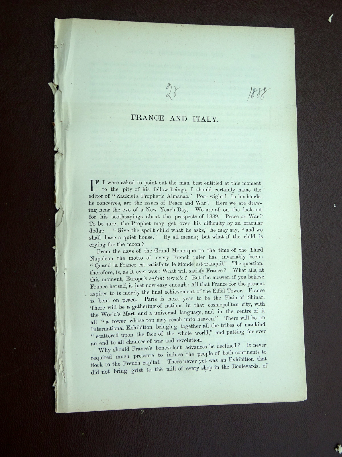 France and Italy. Complete original 1888 article from The Contemporary Review,