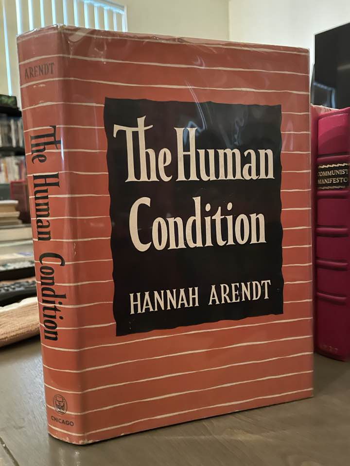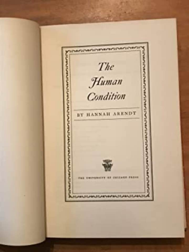 Octavo, vi, 332 pages. First printing, with date 1958 and no subsequent printings on verso title page. Publisher's binding sturdy, boards sunned, light wear to corners and to head and foot of spine, gold-stamped lettering at spine crisp; contents unmarked and attractive. unclipped ($4.75) jacket is in excellent condition displaying the very mildest rubbing at the tips. ,An overall excellent copy. The Human Condition, first published in 1958, is Hannah Arendt's account of how "human activities" should be and have been understood throughout Western history. Arendt is interested in the vita activa (active life) as contrasted with the vita contemplative (contemplative life) and concerned that the debate over the relative status of the two has blinded us to important insights about the vita activa and the way in which it has changed since ancient times. She distinguishes three sorts of activity (labor, work, and action) and discusses how they have been affected by changes in Western history (Wikipedia). Seller Inventory # 602