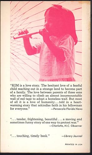 Add to basketA Paperback Library True Story, printed April 1971. Condition is very fine, looks unread, has slight edge wear from shelving, no writing or stamps, light tanning on cover and pages, cover bright and glossy, a nice looking book.*We have other titles in this genre in stock and give discounts in shipping on additional books sent in the same package, please contact us for more info.**.WRAPPED IN PLASTIC BAG TO PROTECT CONDITION OF BOOK.Summary - A true story of a father's search for a lost child told with "genuine candour and tenderness.makes moving reading." Publishers' Weekly "KIM is a love story. The hesitant love of a fearful child reaching out in a strange land to become part of a family . The love between parents of three sons who are willing to climb an almost insurmountable wall of red tapes to adopt a homeless waif. But most of all it is a love of humanity.told in a heart-warming story that rekindles faith in his fellowman for everyone.".