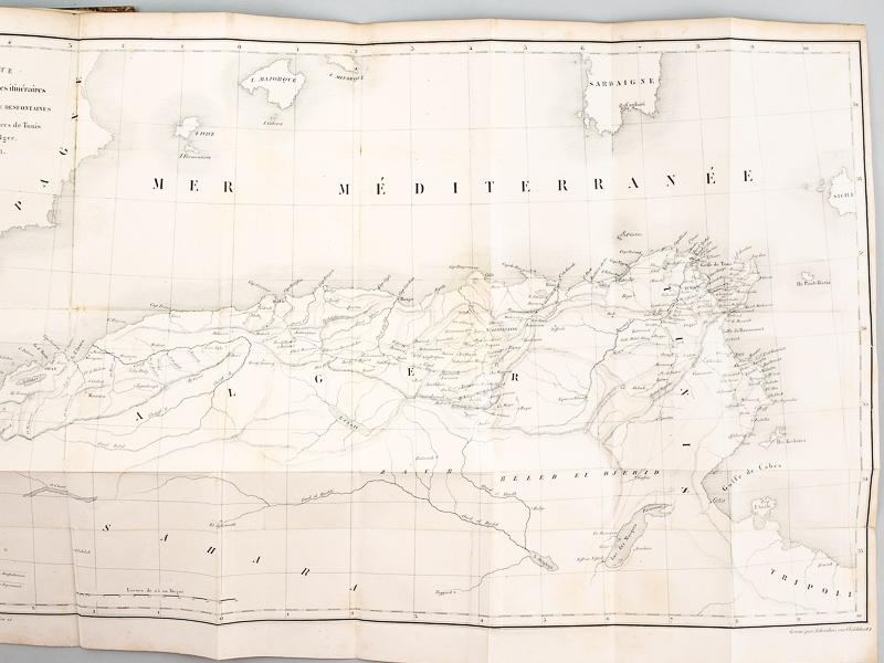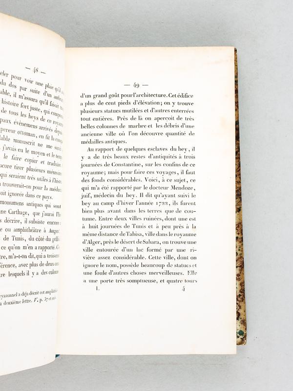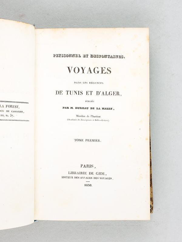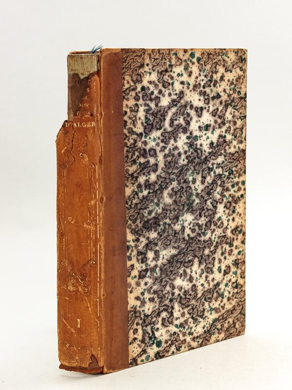 Publiés par M. Dureau de La Malle, 1 vol. in-8 reliure demi-veau caramel, Librairie de Gide, Paris, 1838, xxxvii-485 pp. avec 3 planches lithographiées et la grande carte dépliante Etat moyen (dos très abîmé avec mq., belle fraîcheur intérieure). Exemplaire du tome premier de l'édition originale, méritant une restauration de qualité. Bien complet des 3 planches et de la grande carte dépliante. Prix en l'état. L'ouvrage contient la relation (sous la forme de douze lettres, adressées au conseiller Bignon, au géographe Delisle et à Chirac, médecin), du voyage d'étude mené par le médecin et naturaliste Jean André Peyssonnel dans les régences de Tunis et d'Alger, les années 1724 et 1725. Langue: Français. Seller Inventory # 50699