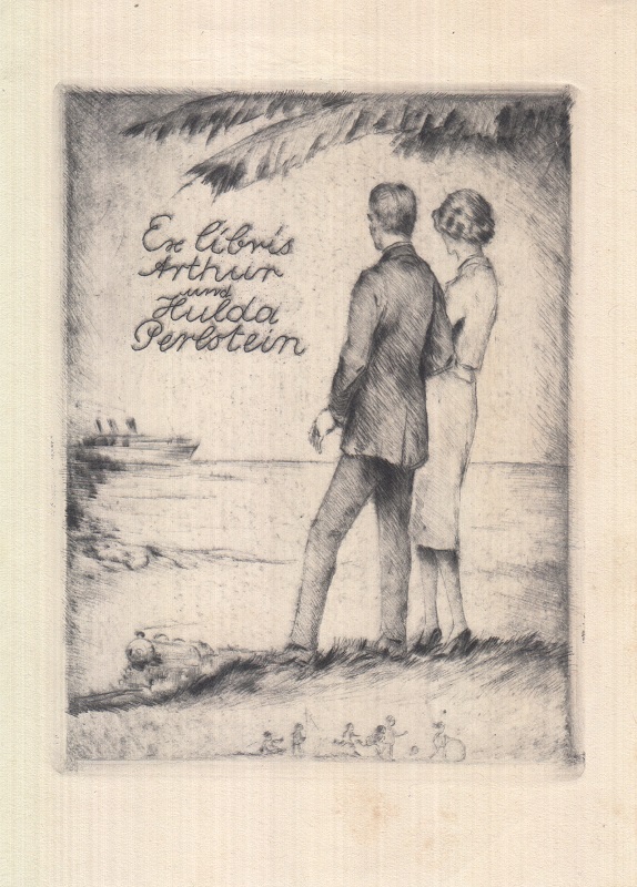 Ex libris Arthur und Hulda Perlstein. Paar am Ufer, zu Dampfer blickend. Kinder als Remarquen.