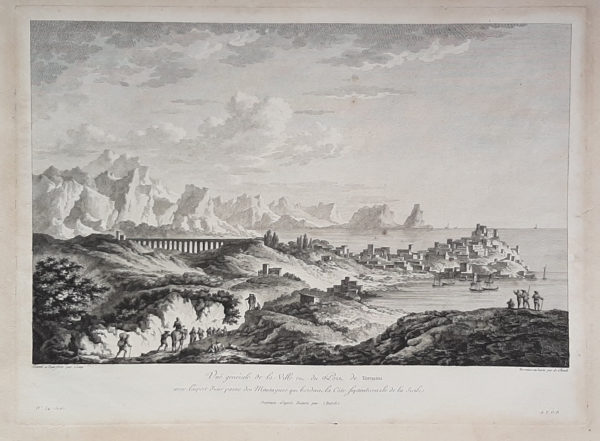 Add to basketIncisione in rame. Veduta panoramica della città di Termini Imerese, con una parte delle montagne lungo la costa settentrionale della Sicilia. Tratta dall'edizione settecentesca di «Voyage Pittoresque ou description des Royaumes de Naples et de Sicile». Opera composta da 5 volumi che l'abate Saint Non ultimò tra il 1781 e il 1786. Bella incisione in perfetto stato di conservazione. Formato: 270x375mm (più ampi margini).