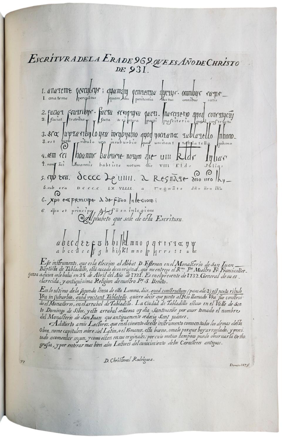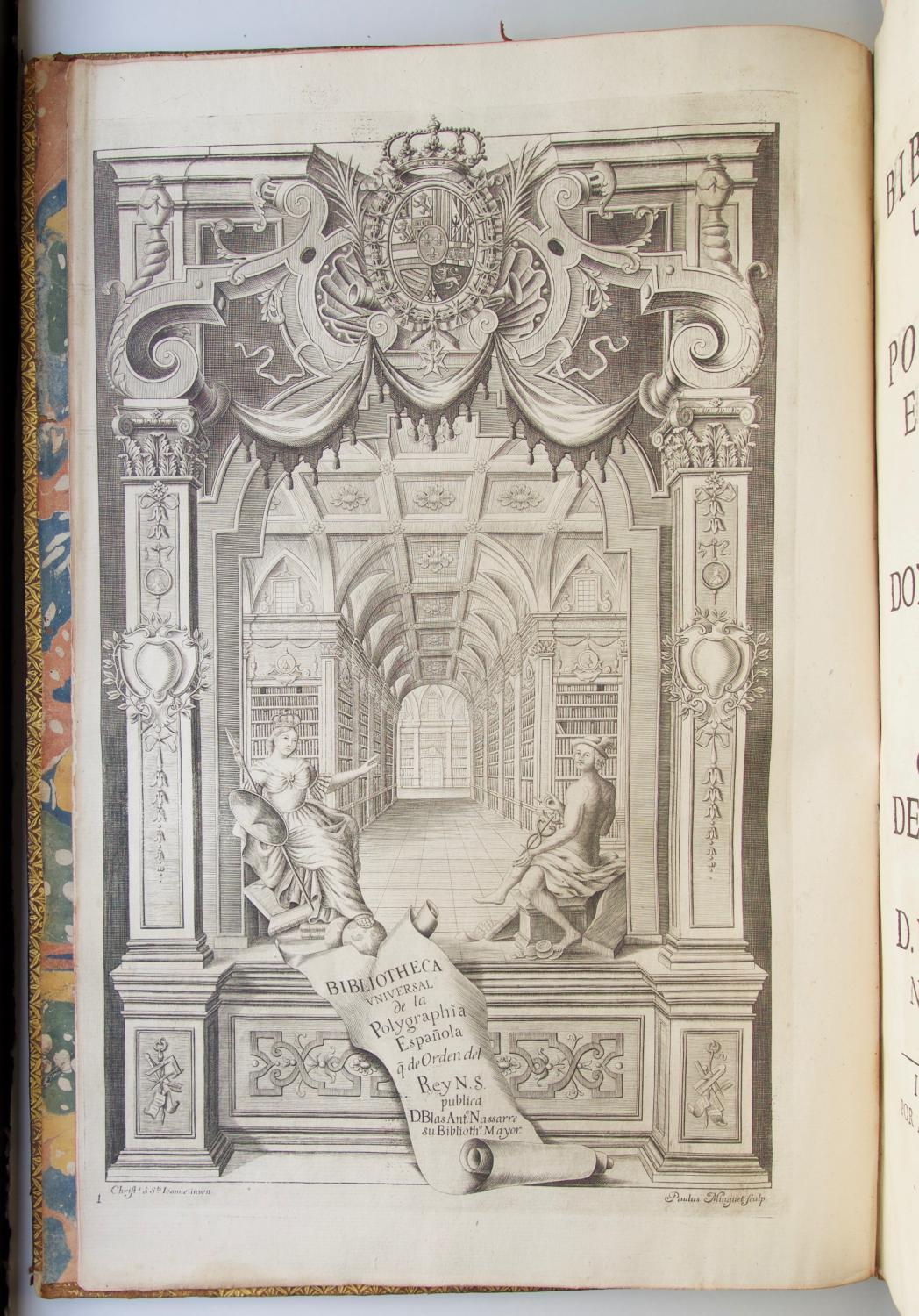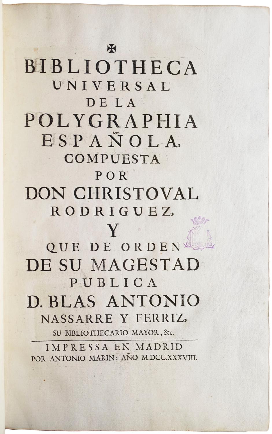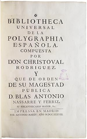 Large folio (41 x 28 cm.), contemporary Spanish mottled calf (spine chipped and joints cracking at head and foot, hinges weak, rubbed), spine richly gilt in seven compartments with red morocco lettering-piece in second compartment from head, gilt border on each cover, marbled endleaves, text-block edges rouged. Lavishly illustrated with engraved plates, vignettes, and initials; woodcut headpieces, illustrations, and initials. Greek type on several pages. Occasional light offsetting from plates and text; 2 folding plates with short tears repaired, without loss; a few small stains and occasional minor soiling. Internally in fine condition; overall very good. Old purple stamp of the Dukes of Palmela (a ducal coronet over the monogram) in blank portion of letterpress title; unidentified armorial label (chipped) at spine foot. Engraved title (numbered 1), (3), xxvii ll., 6 ll. engraved plates (numbered 11, 33-4, 36-8), engraved title (numbered 53, dated 1729), engraved portrait (numbered 54), (36 ll.), 4 engraved calligraphic titles (general title plus section titles introducing plates of fourteenth-, fifteenth- and sixteenth-century scripts) and 123 plates (numbered 55-181; including 3 folding, 1 double-page, and 34 printed on both sides of 17 ll.). Large engraved headpiece, 2 engraved initials, 3 engraved and 35 woodcut illustrations (several full-page) in text. A very good copy in an attractive contemporary binding. *** FIRST EDITION of this fundamental work on Spanish and Portuguese paleography. When Rodriguez began this study in 1708 he thought he would be the first to write about the script of early documents for the general public. While the work was in progress, however, he came across Mabillon's De re diplomatica (1681-1704), which covered only scripts through the tenth century. Rodriguez incorporated about fifteen of Mabillon's plates into this study. Because Rodriguez covers scripts through the sixteenth century, his work is a significant extension of the study of scripts. Bibliotheca universal was the first study of Spanish scripts following Mabillon's.In the prologue (pp. i-xxvii) the editor, D. Blas Antonio Nassarre y Ferriz (the King's chief librarian) explains Rodriguez's theories about script. This section includes thirteen engravings and woodcuts showing more than thirty coins from ancient and medieval times. It also includes engraved and woodcut representations on fifteen leaves of medieval monuments, among them several in Arabic. The prologue is followed by a number of lengthy censuras and aprobaciones that evaluate the usefulness of the work, describe the state of paleographical studies in the early eighteenth century, discuss the various scripts used in Spain and its New World colonies over the centuries, and explain the value of being able to read ancient documents and inscriptions.The main text, which begins with its own engraved title page, has expertly prepared plates, many of which were not only drawn but engraved by Rodriguez himself. The examples are arranged in chronological order with separate section titles for each century, beginning with antiguo (Roman and medieval), then progressing through the fourteenth through sixteenth centuries. There are separate plates for Catalan, Valencian, and Portuguese paleography. Many plates are enhanced by an interlinear transcription in italic script and include an alphabet at the foot of the plate.The plate facing the printed title page shows a library with coffered ceiling whose shelves recede far into the distance. At the left Minerva (crowned and wearing period dress, holding a shield and spear) looks toward the reader and gestures toward the library. On the right Mercury, modestly draped, wears a winged hat and holds a caduceus and also gestures toward the library. The library and its patron deities are set within an elaborate architectural frame. Crowning it are the royal arms of Spain. At the foot, a partially unrolled sheet bears the book's title and the na. Seller Inventory # 23528