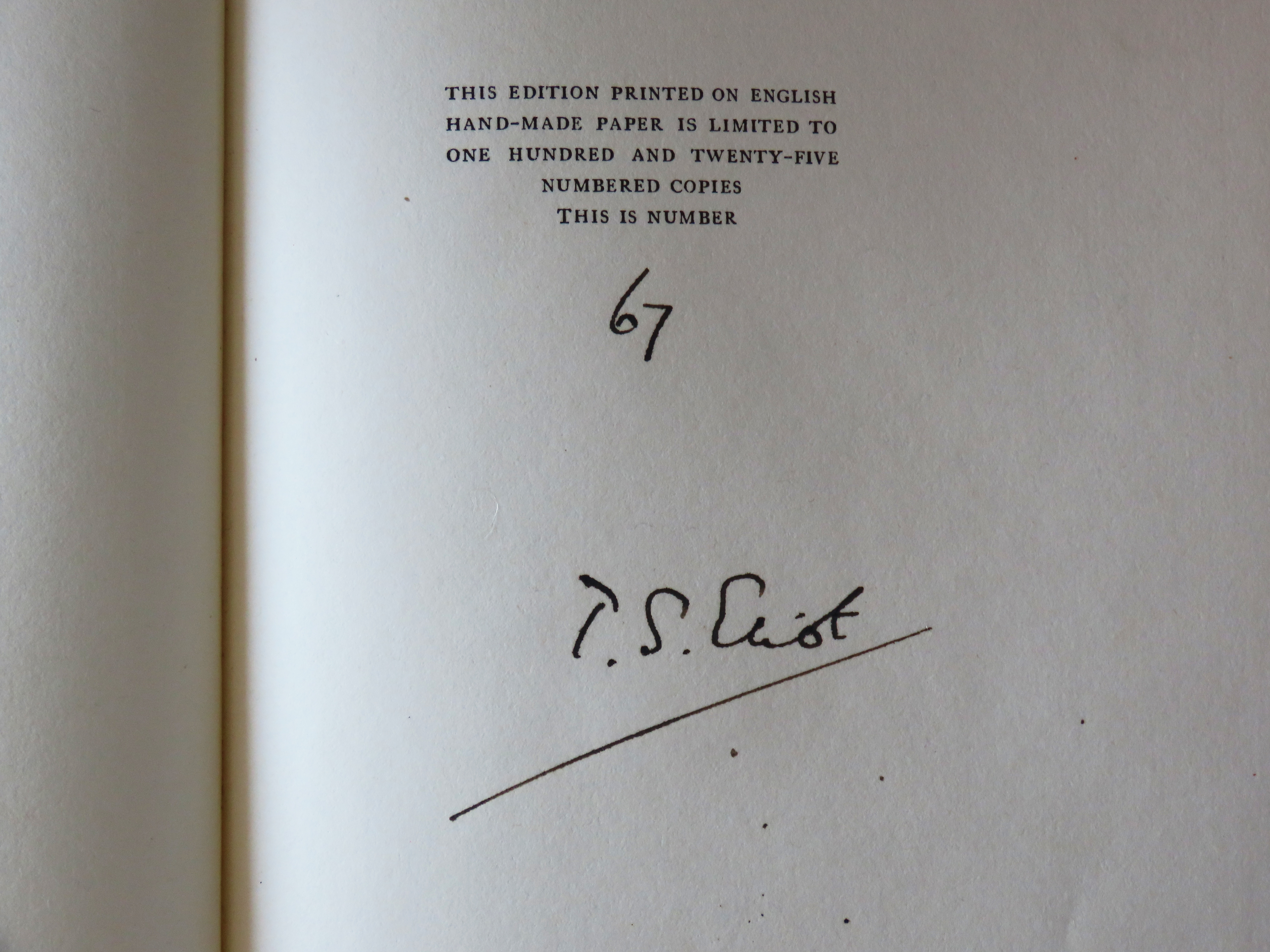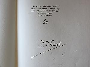 Add to basketLIMITED EDITION, number 67 of 125 numbered copies, signed by Eliot to the limitation leaf. Number 2 in the publisher's 'Poet on the Poets' series. With the library plate of writer, teacher and cricketer Dennis Silk to front pastedown. Eliot dedicated this volume to Charles Maurras, the French thinker and determined anti-modernist. Octavo. Original blue-green cloth boards, titled to spine in gilt, top edge gilt, other edges untrimmed. Sunning to spine and to outer edges of boards, occasional spotting to edge of text block and in a few places to boards. Clean and fresh othewise, largely unopened. Lacking the rare glassine dust jacket. Very good indeed. [Gallup A13b].