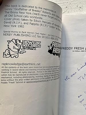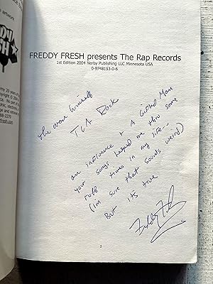 Signed copy of this incredible hip hop resource, signed by creator Freddy Fresh to T La Rock, who's single "It's Yours" from 1984 was the first hip hop 12" released by Rick Rubin on Def Jam. Incredible book, with 300+ pages of information on hip hop releases, including images of the records themselves. Well bound copy, solid and sound. Interior is bright and clean with no marks besides the inscription on the front page. Covers are clean overall with one long crease across the bottom right corner of the front cover and some other light stray crease marks to front and back, although not actually badly bent or deeply creased, and now in protective mylar. Overall a really nice association copy of this special publication. Seller Inventory # ABE-1734984648373