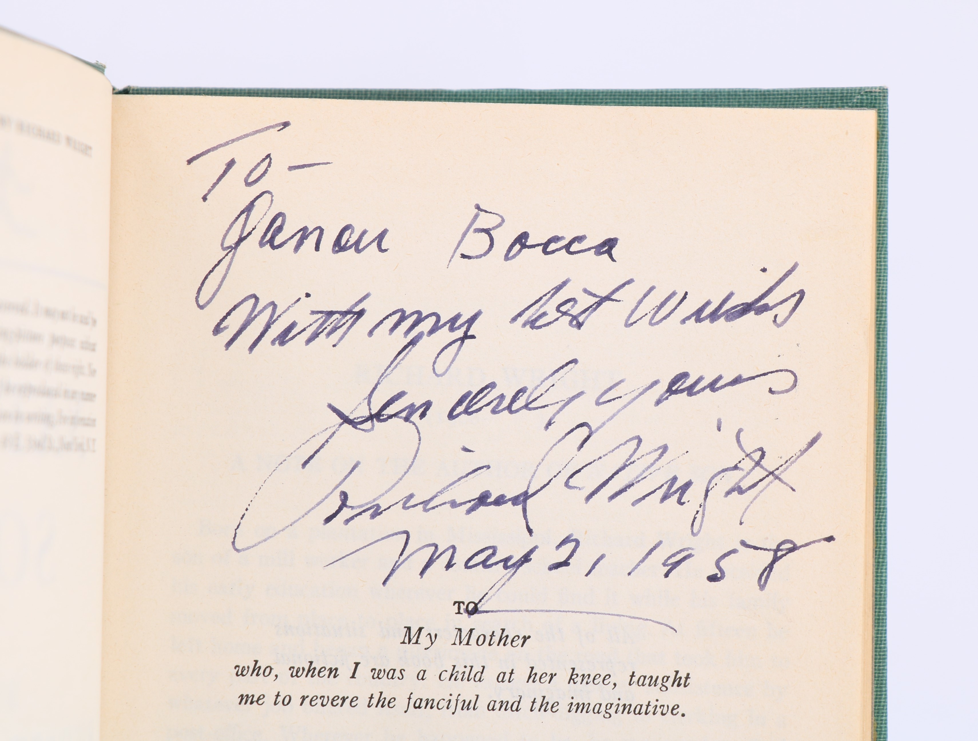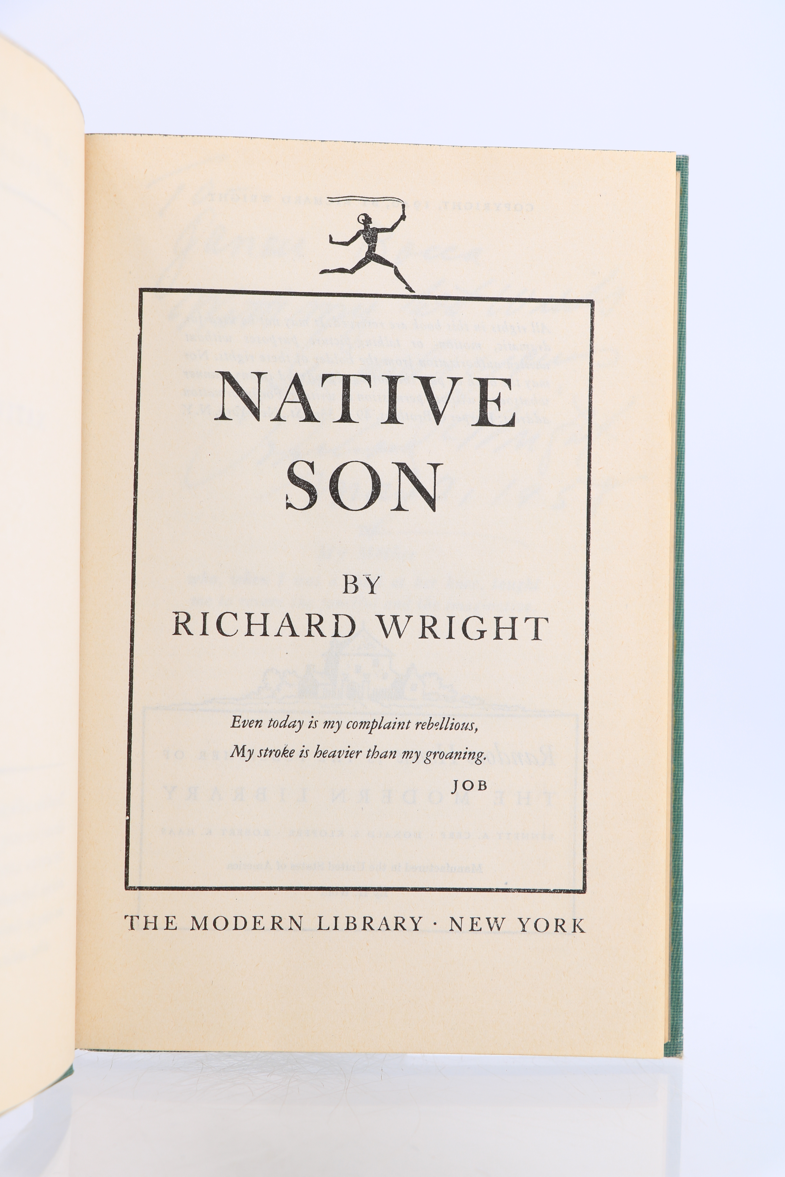 Add to basketThe modern library | New York 1940 | 12.5 x 19 cm | Reliure de l'éditeur | Nouvelle édition. Reliure de l'éditeur en pleine toile verte, dos lisse, exemplaire complet de sa jaquette illustrée avec quelques petites déchirures et légers manques. Le verso du premier plat de la jaquette comporte un manque angulaire au niveau du prix de l'ouvrage. Envoi autographe daté et signé de Richard Wright à Ganan Bocca. | [ENGLISH DESCRIPTION FOLLOWS] Later edition.Publisher's full green cloth binding, smooth spine, copy complete with its illustrated dust jacket which shows a few small tears and minor losses.The verso of the front panel of the dust jacket shows an angular loss affecting the printed price.Dated and signed autograph inscription from Richard Wright to Ganan Bocca. *.